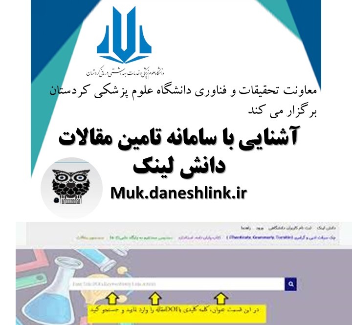 معاونت تحقیقات و فناوری دانشگاه با هدف ارتقا جایگاه علمی دانشگاه علوم پزشکی کردستان در سطح دنیا، از طریق ارتقا کمی و کیفی فعالیتهای پژوهشی اعضا هیئت علمی آموزشی و پژوهشی و محققین و دانشجویان دانشگاه اقدام به خریداری و عقد قرارداد" سامانه تامین مقالات دانش لینک" نموده است. از امکانات موجود در این سامانه که به آدرس muk.daneshlink.ir قابل دسترسی است. می توان دسترسی به پایگاههای استنادی معتبر ازجمله Scopus, Web of Sciences و همچنین دسترسی رایگان به مقالات ناشران معتبر دنیا مانند: