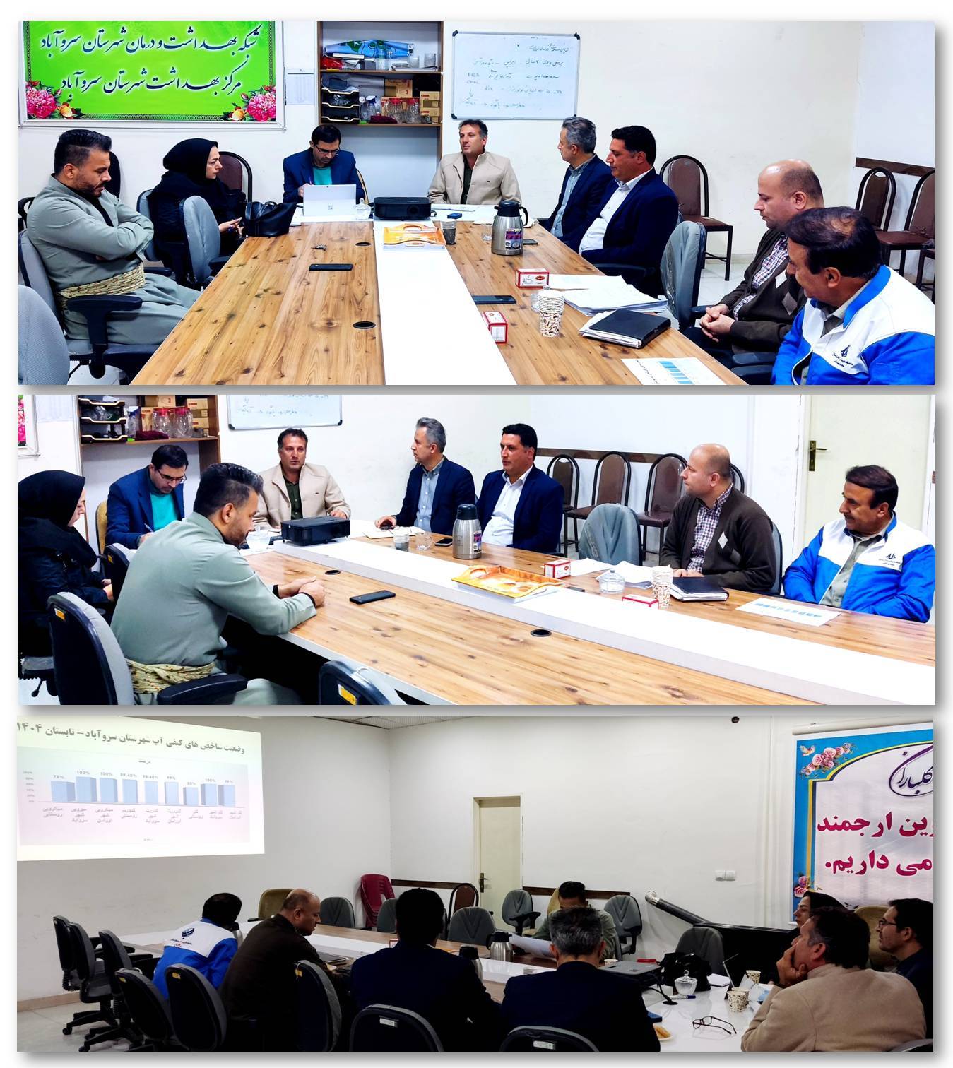 جلسهای مشترک با حضور مسئولین شبکه بهداشت و درمان شهرستان سروآباد و نمایندگان آبفای استان و کشور بهمنظور بررسی نتایج تجزیه و تحلیل شاخصهای کنترل کیفی آب آشامیدنی این شهرستان و تصمیمگیری در خصوص اقدامات اصلاحی و بهبود کیفیت آب برگزار شد.